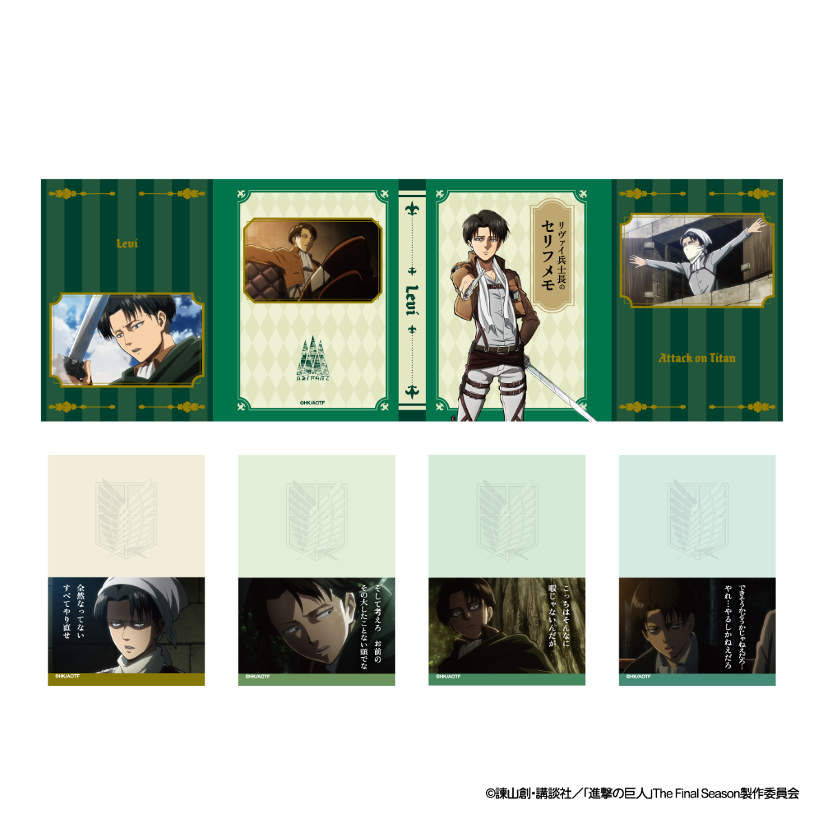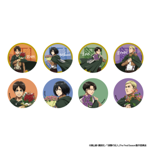Newly illustrated original artwork of Eren, Mikasa, Levi, Erwin, and others will appear as can badges and acrylic stands. In addition, Titans drawn in original illustrations will feature on items such as handkerchiefs, acrylic keychains, and eco bags. A total of 36 original items will be available, including must-see merchandise packed with playful references for fans, such as “Captain Levi’s Quote Memo” and Armin’s “An Endless Lifetime’s Worth of Salt.”